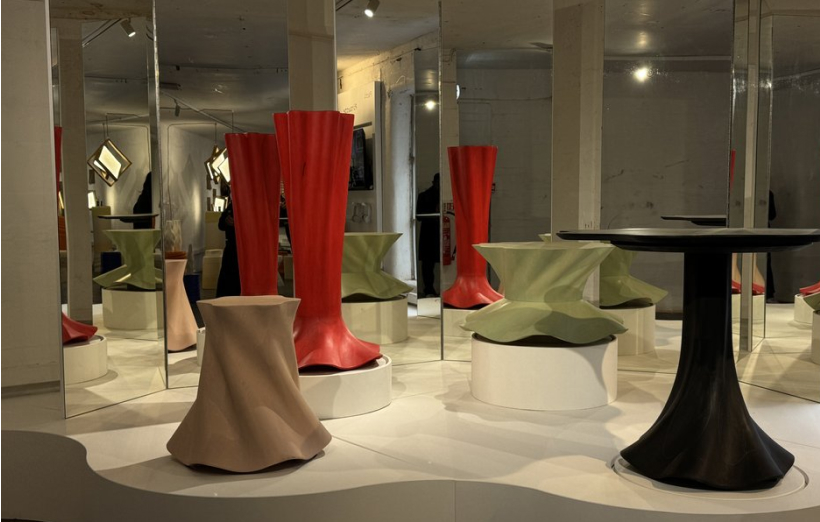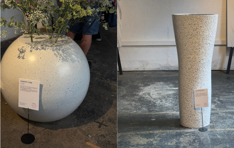 Another standout at the fair was Crafting Plastics’ ‘Senseables’ collection, consisting of stackable, versatile stools made from NUATAN – a biobased and biodegradable material. These playful pieces are designed for all ages, with the latest interactive version featuring a solar-active bioskin that reacts to UV radiation, changing colour in real-time based on the UV index. Alongside making each item entirely unique, this clever design raises awareness of solar radiation and invisible environmental threats through the material’s responsive properties. Crafting Plastics also showcased a lighting collection designed with a “no glue, no screws” policy, instead utilising materials that naturally degrade together.